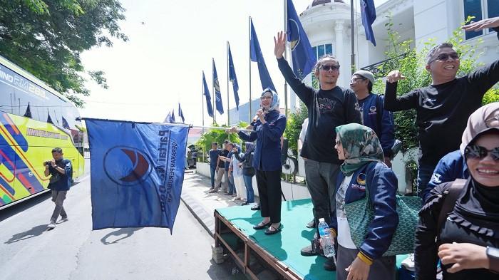 Ketua DPW Partai Nasdem Provinsi Sulawesi Tengah, Nilam Sari Lawira, melepas secara resmi 380 kader Nasdem menuju Rapat Kerja Nasional (Rakernas) I Partai Nasdem di Kota Makassar, Sulawesi Selatan, Kamis (7/8/2025) (Dok: Tribun Palu)