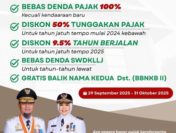 Irvandi menegaskan, diskon tidak hanya berlaku bagi pemilik kendaraan dengan tunggakan, tetapi juga bagi wajib pajak yang tertib membayar. Diskon yang diberikan 9,5 persen. Contohnya, jika jatuh tempo pajak pada 10 Oktober 2025.