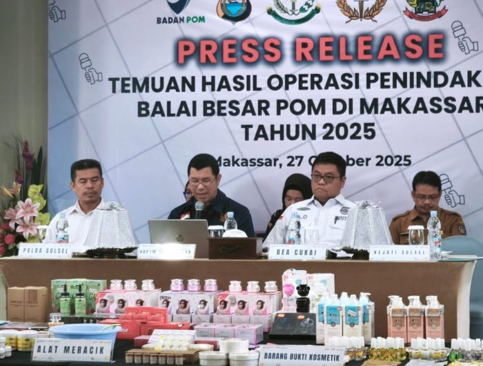 Berandaindonesia.com, Makassar – Balai Besar Pengawas Obat dan Makanan (BBPOM) di Makassar kembali menunjukkan komitmennya dalam melindungi masyarakat dari bahaya peredaran produk Obat dan Makanan ilegal/Tidak Memenuhi Syarat (TMS) yang berisiko terhadap kesehatan. Komitmen ini diwujudkan melalui operasi penindakan terhadap praktik produksi dan peredaran kosmetik ilegal.